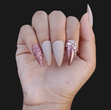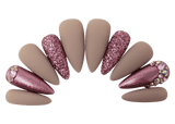Our handcrafted accent sets feature lovely hand placed accent nails. "Alala" is a gorgeous nude and rose gold set with glitter and crystal accents.