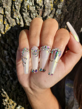 Our stunning handmade sets can be made in your desired size and shape. This gorgeous set features Swarovski crystals and an actual unicorn! Because of it's unique features, this set can only be made in long coffin.